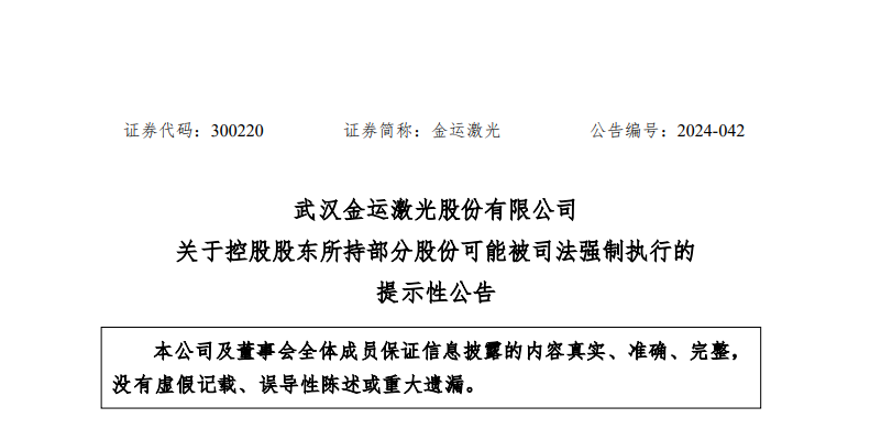 7月12日,金運(yùn)激光發(fā)布公告,披露企業(yè)實(shí)際控制人梁偉因未能及時(shí)履行民事調(diào)解書中的義務(wù),被裁定凍結(jié)、劃撥相應(yīng)存款,且有可能將導(dǎo)致其持有的部分股份遭遇司法強(qiáng)制執(zhí)行從而產(chǎn)生變動(dòng)。